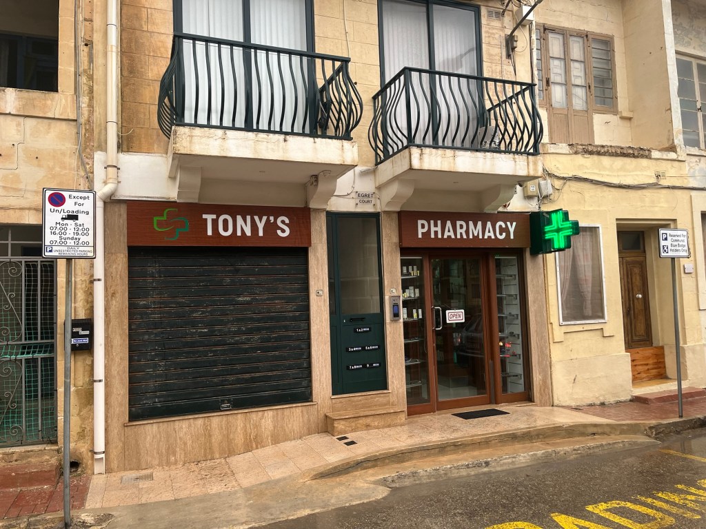 How wonderful having Tony the Pharmacist only one block away when Rebecca has been fighting a cold, cough, and bacterial infection. One of many Marsalforn sweethearts!