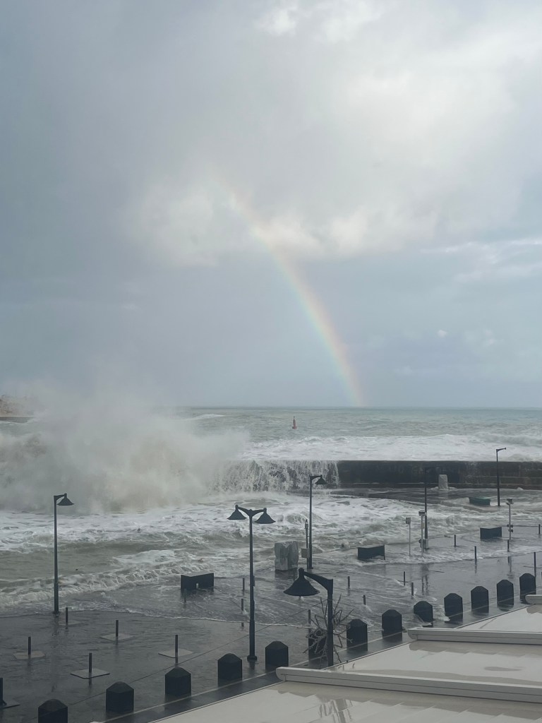 What a tempest: Mediterranean Storm Harry! Two-plus days of 65+-mph winds! Thank goodness for a comfy hotel room … with a view.