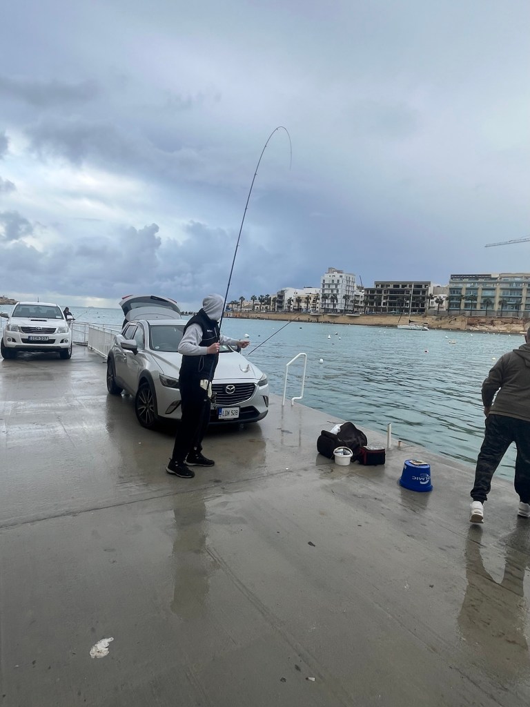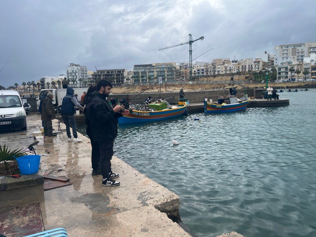 I needed about 10 seconds to learn what was going on: the dam to the local fish farm had burst in the storm. Thousands of “sea bream” had escaped and swum into Marsaskala Harbor. The water was thick with fish, and the residents of Marsaskala were taking full advantage of the windfall.