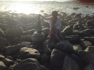 CA Big Sur Hippie chick building a cairn