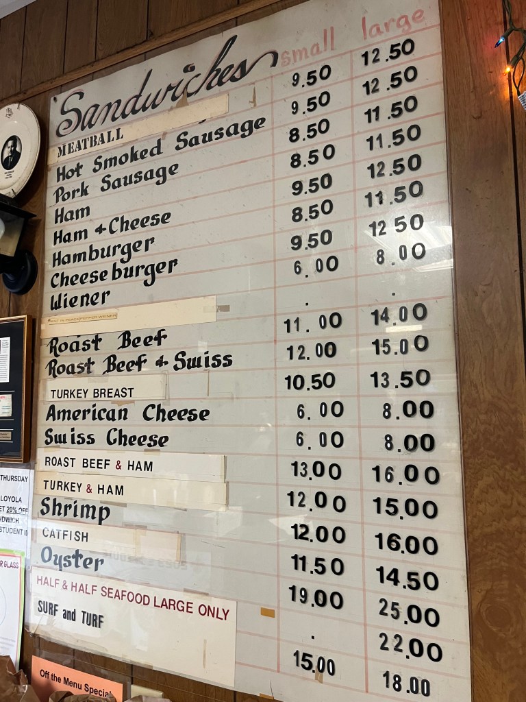 Domilise’s dealt with the loss in true New Orleans fashion: instead of removing the sandwich from the menu, they taped over “pepper weiner” and replaced it with this thought: “Rest in peace Pepper Weiner.” I reckon that sentiment has been on the menu in that form for 40 years or more. (And disregard all spelling discrepancies; it is New Orleans and it really doesn’t matter!)