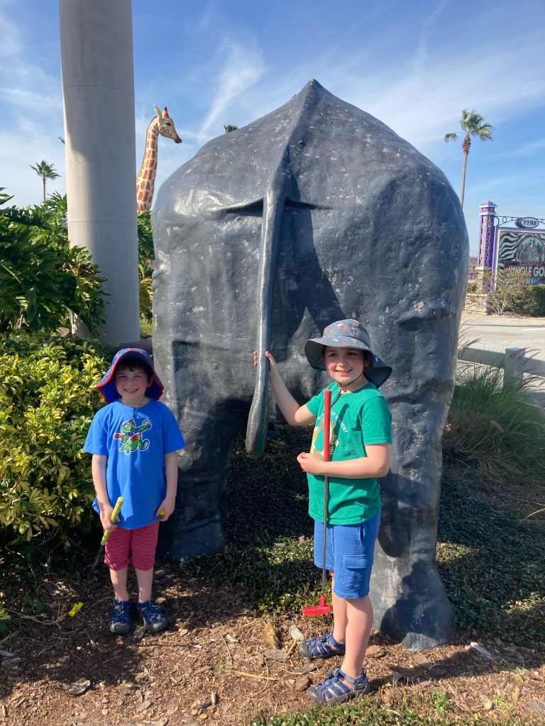 Joanna had planned to arrive on Wednesday, but high winds and travel advisories in Boston gave her an excuse to get in a day early. Great for cooking, swimming, and the obligatory round of Florida miniature golf, where Mike and Ronan both aced the infamous Butt Hole. Elliott managed a few aces too, but he wiped out on the Butt Hole.