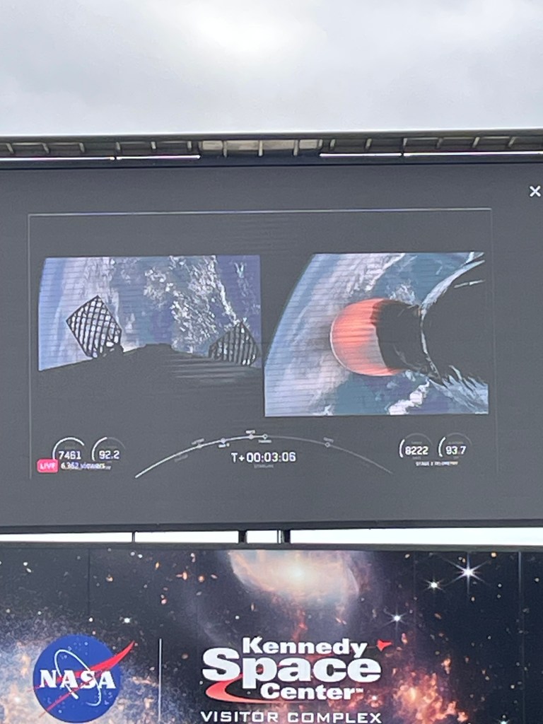 A few minutes into the flight, the rocket jettisoned its launch stage, which fell back to earth. On the right screen, we watched the payload of 23 Starlink satellites make its way to space. On the left screen, we watched the launch stage return home, complete with all of the telemetry. (Thanks, NASA!)