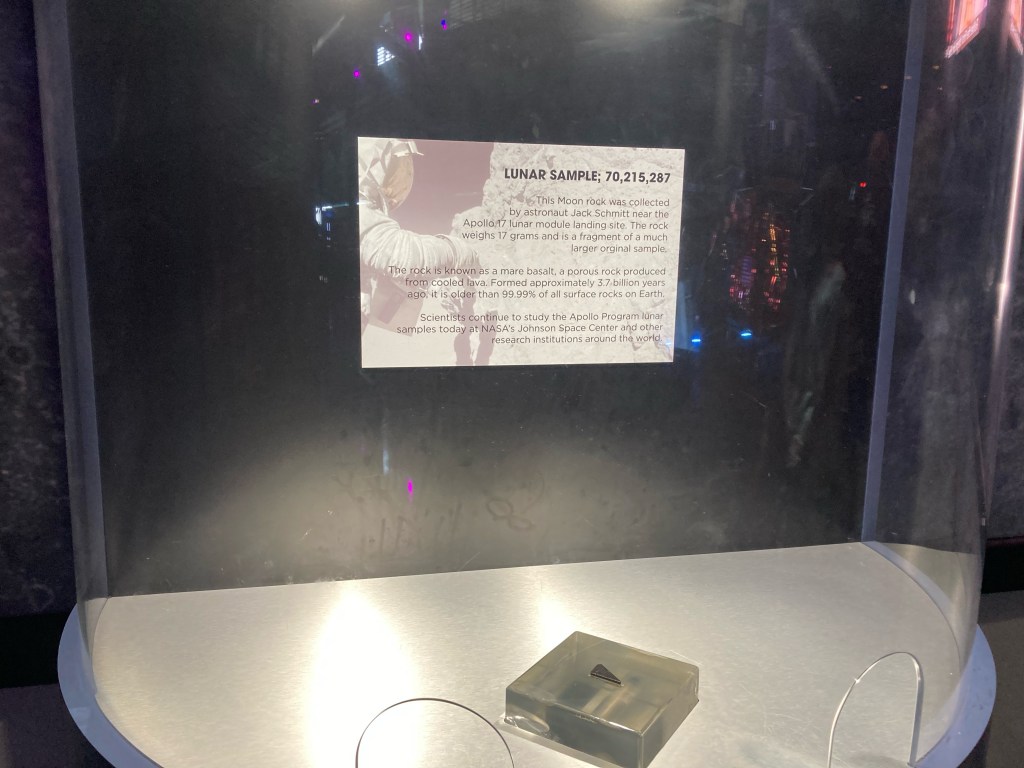 Moon rock, there for the touching.Saturn 5. In your face!Yup. They take better road trips than we do.