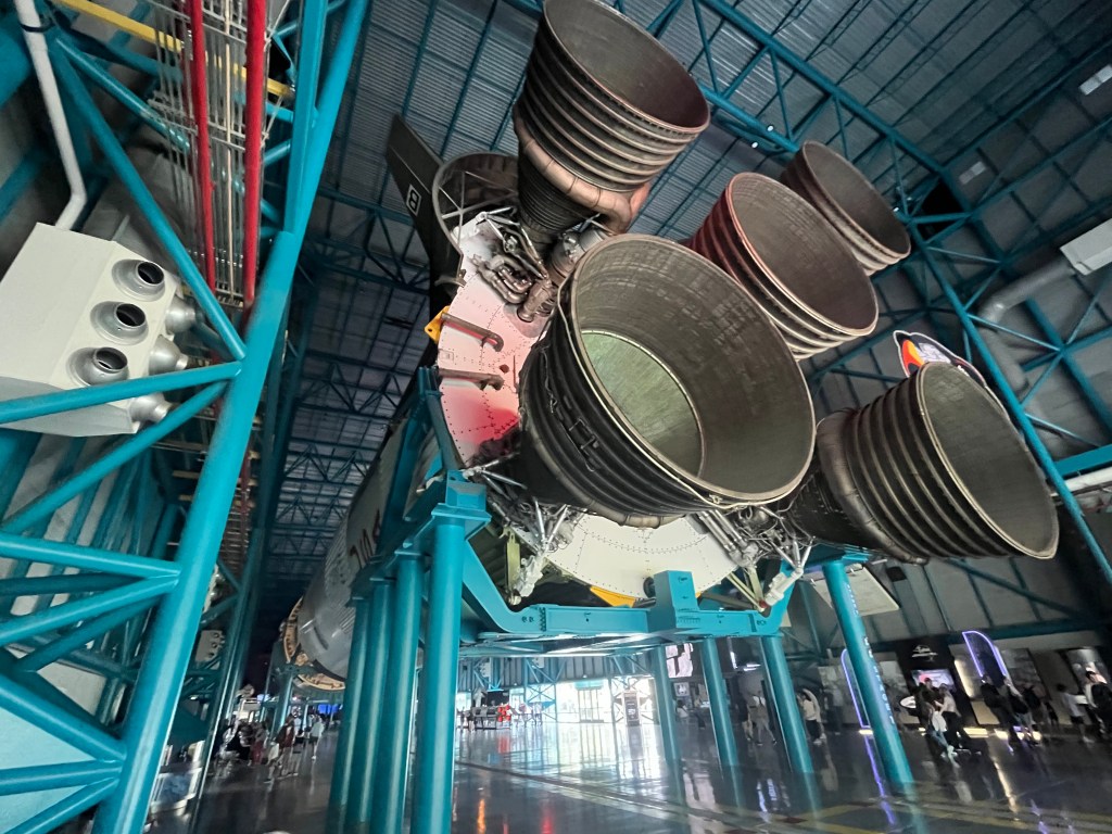 Thursday was Daddy heaven: a full day at Cape Canaveral starting with a Space X launch minutes after we arrived, a first for all seven of us. The cloud cover was thick, but NASA offered an assist by virtue of a very large split-screen TV. The viewing crowd of only a few hundred roared the countdown. The blast-off was blindingly bright even if, in our case, it only lasted a few seconds because of the cloud cover. Moments after the blast-off, a cloud of smoke rose from the launch pad. Then the sound enveloped us: a growing roar that has no equivalent I can think of. It just keeps getting louder until it peaks, and then it slowly disappears. Man, that is a lot of energy!