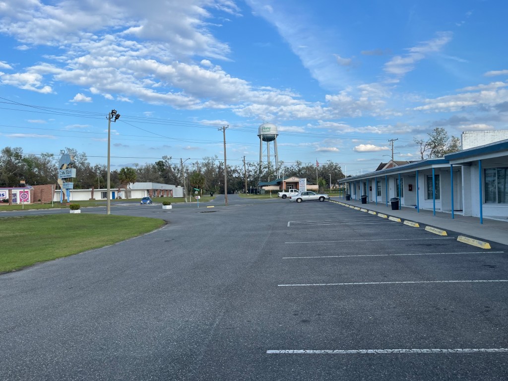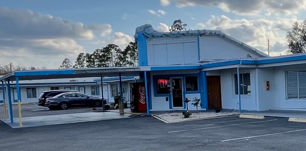 It is remarkable how a County Seat at a crossroad in Florida not far from Tallahassee can be so desolate, but Perry has found a way. There are two new motels in Perry, a Hampton Inn and a Holiday Inn Express, but they were both damn near $200. We just hate spending that much for a quick overnight. There was one other possibility: The Royal Inn on Route 27, a privately-owned spot that looked neat and friendly, despite the roof damage from last August’s Hurricane Idalia that damn-near decimated Perry.